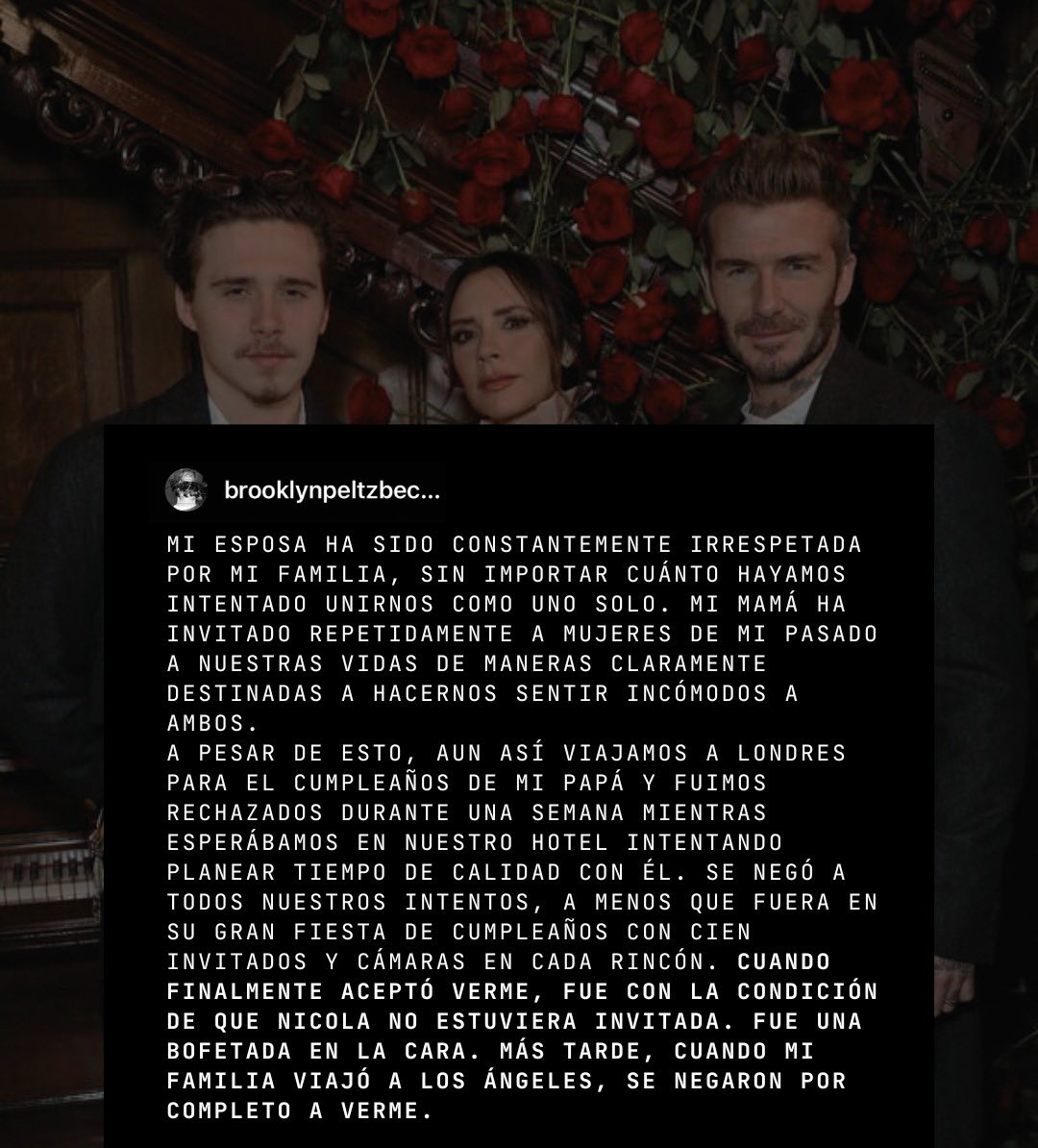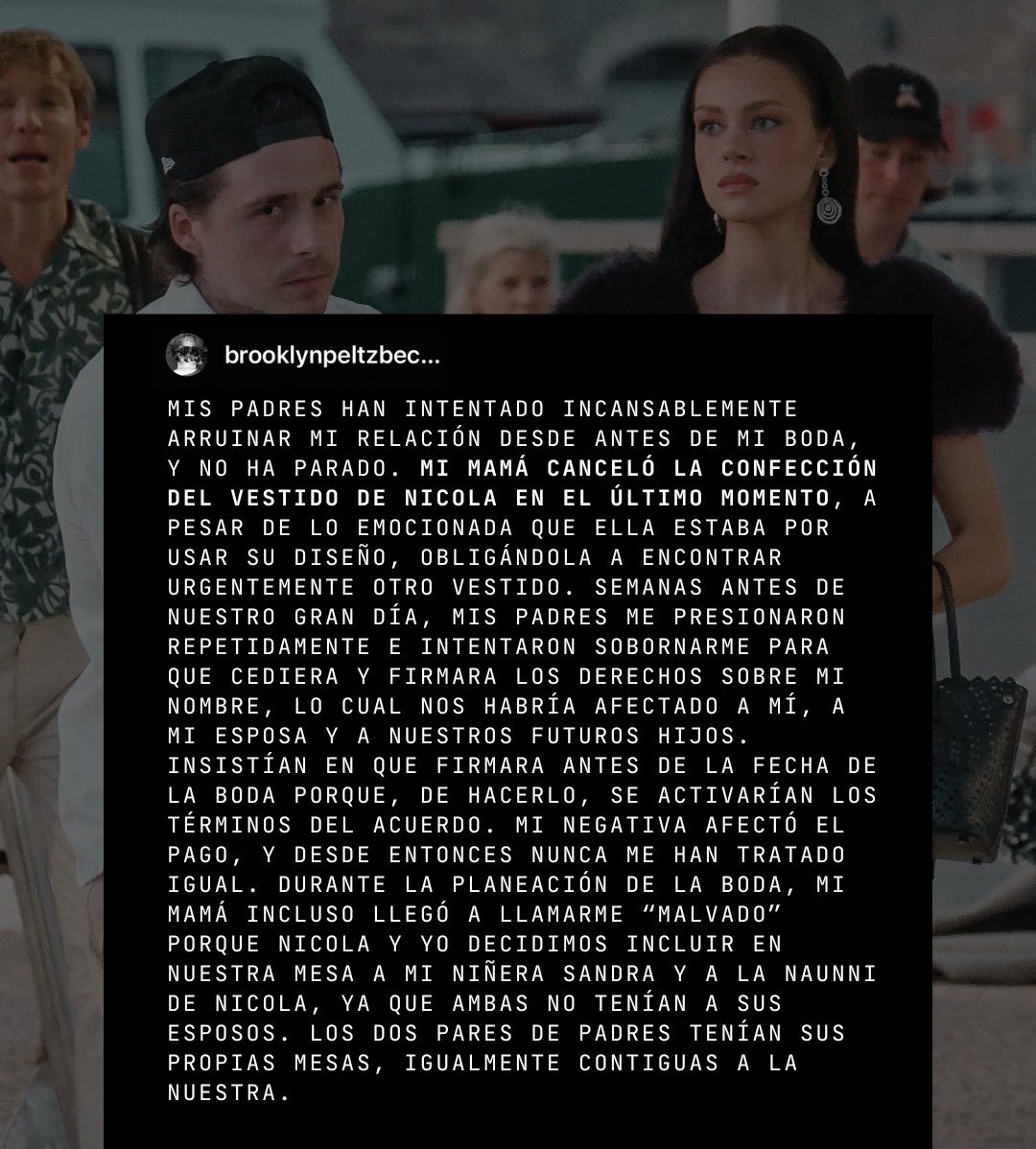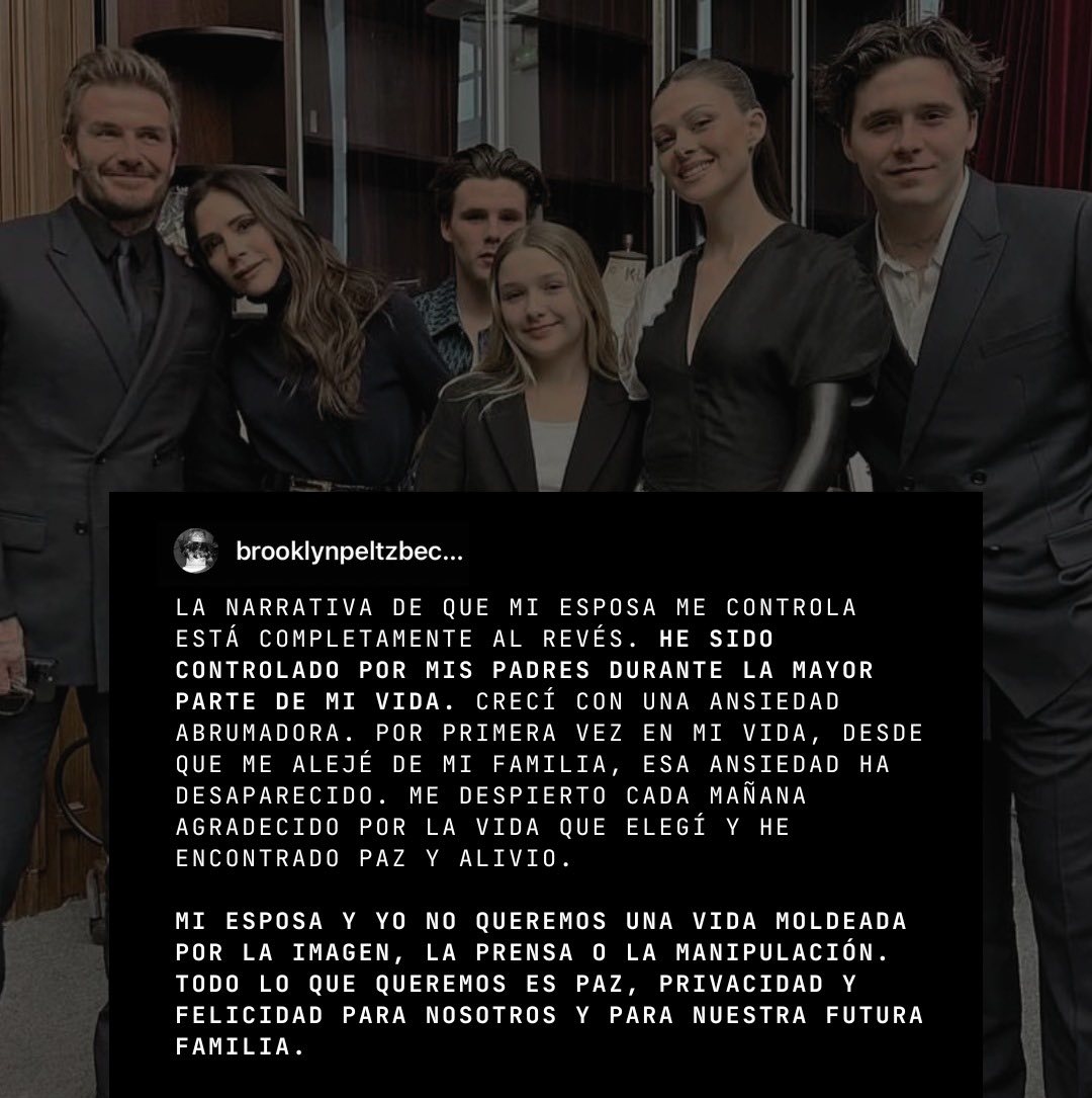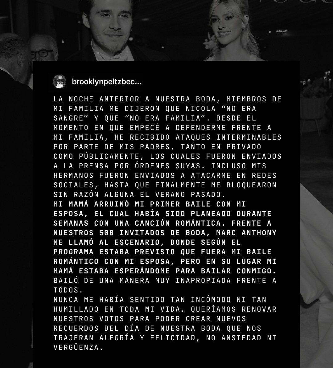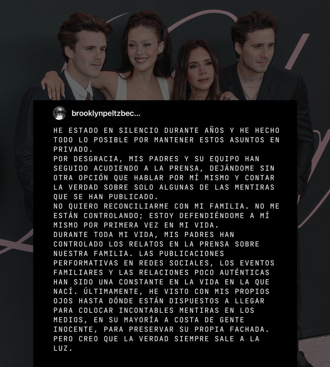 "No quiero reconciliarme con mi familia", afirma tajante Brooklyn en un comunicado emitido en Instagram esta tarde y que confirma los rumores de una ruptura con sus padres, a quienes acusa de "arruinar sin parar" su relación de pareja con su ahora esposa