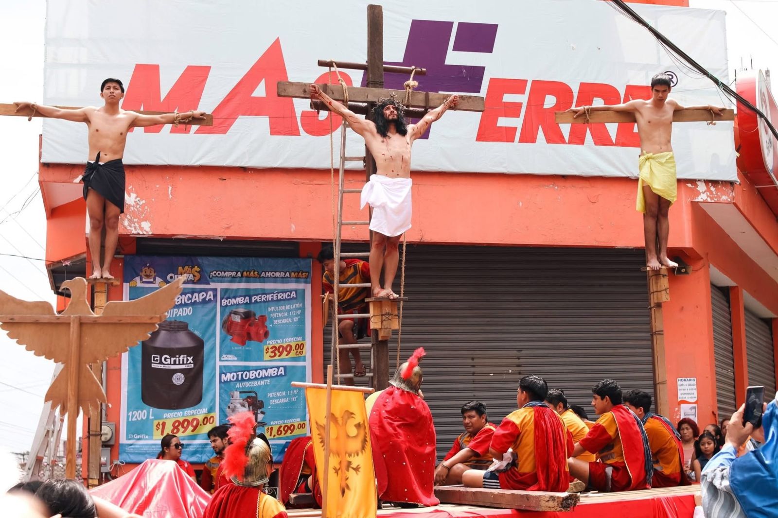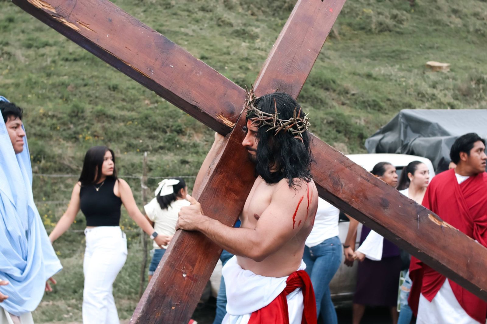 La representación, que recorrió desde la gasolinera hasta el parque Miguel Hidalgo bajo la supervisión del párroco Francisco Martínez, contó con la participación de decenas de feligreses, en su mayoría jóvenes, quienes recrearon la pasión de Cristo.
