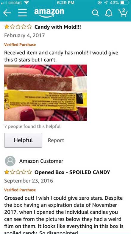 "¡Asqueado! Ojalá pudiera dar cero estrellas. Aunque la caja aún no estaba pasada, cuando la abrí cada uno de los dulces tenía una capa extraña en ellos. Parece que todo estaba echado a perder. Estoy tan decepcionado.”