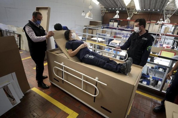 La cama-ataúd está hecha 100 por ciento con cartón corrugado biodegradable y está pensaba para los pacientes con COVID-19.