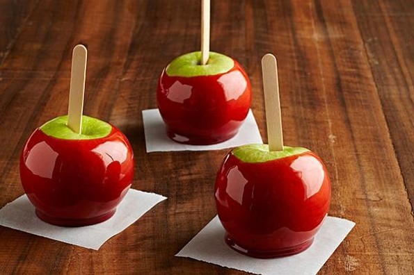 Caramelizar las manzanas: Pasar las manzanas por el caramelo y rápidamente introducirlas en un bol con agua fría para que el caramelo se endurezca. Después se sacan y sacuden ligeramente. Si deseas una capa de caramelo más gruesa, repite el baño de caramelo y el enfriamiento.