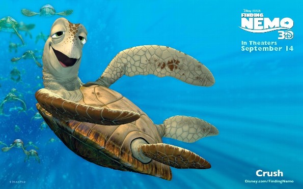 Quizá recuerdes a la tortuga hippie de Buscando a Nemo nadando por la corriente australiana del este. Su nombre es Crush y es una Chelonya mydas, en otras palabras, una tortuga marina verde Crush: Es una relajada tortuga marina (Chelonia mydas) de actitud un tanto hippie, de 150 años de edad que ayuda a Marlin y a Dory a ir a Sídney a través de la CAO (Corriente de Australia Oriental). También es él quien los rescata de las medusas.