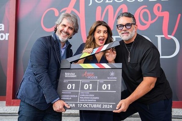 Juegos de amor y poder, protagonizada por Claudia Martín y Arap Bethke, realizó hoy su pizarrazo de inicio de grabaciones en la Plaza de las Estrellas de Televisa San Ángel.