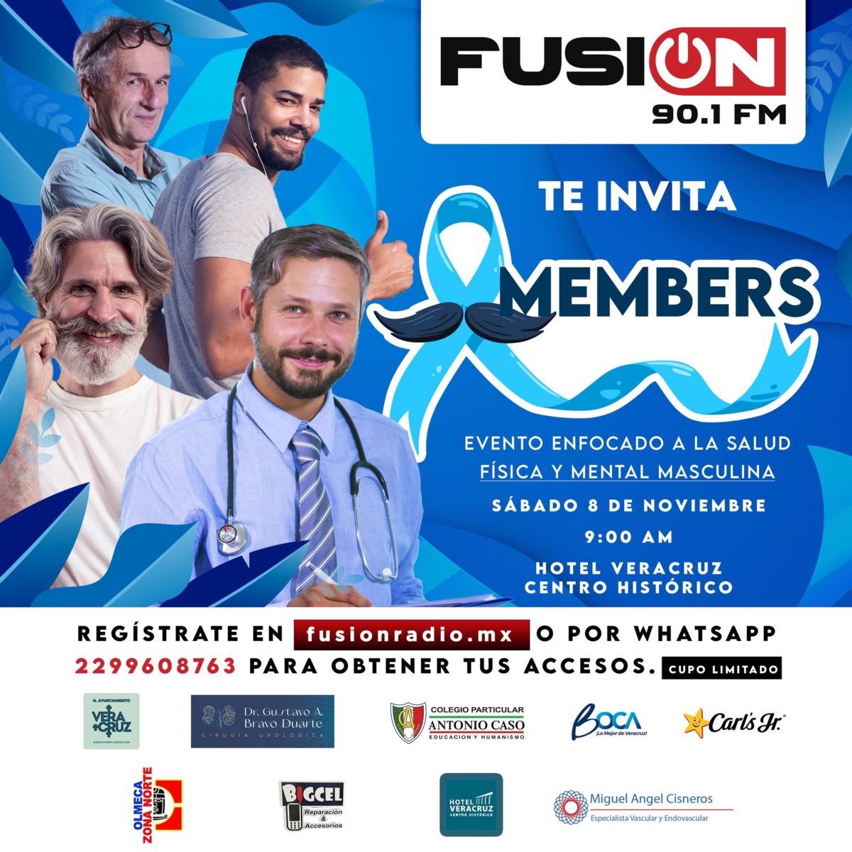 El próximo sábado 8 de noviembre 2025 a las 9:00 de la mañana se realizará un evento gratuito enfocado a la salud masculina llamado “MEMBERS” en el Hotel Veracruz Centro Histórico, organizado y convocado por FUSIÓN 90.1 FM.