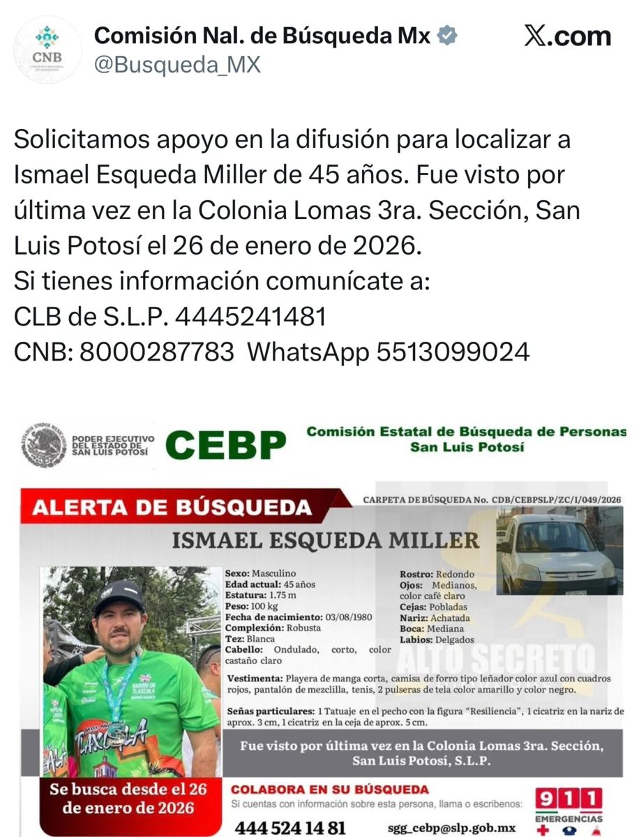 La Comisión Estatal de Búsqueda de Personas de San Luis Potosí emitió una ficha para localizar a Ismael Esqueda Miller, nieto de Lucha Villa, quien fue reportado como desaparecido el pasado 26 de enero de 2026.