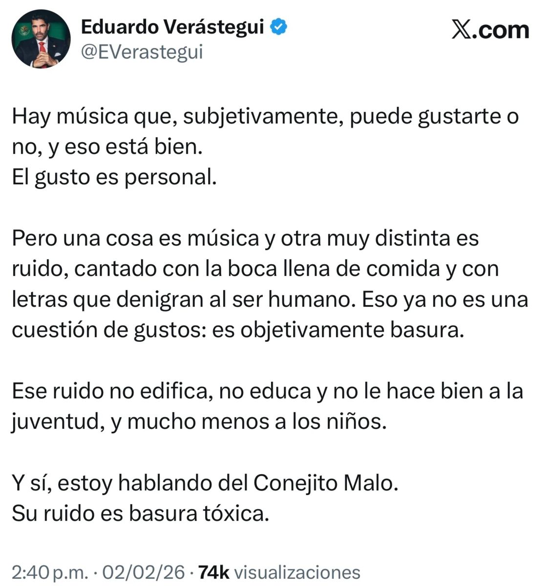 Verástegui calificó a Bad Bunny como “basura tóxica” e invitó a sus seguidores a no escucharlo: "El Conejito Malo, Bad Bunny, se ha convertido en un arma cultural de destrucción masiva, diseñada para erosionar a Estados Unidos desde dentro. Su ruido no es arte: es basura tóxica que envenena a quienes la consumen sin criterio.