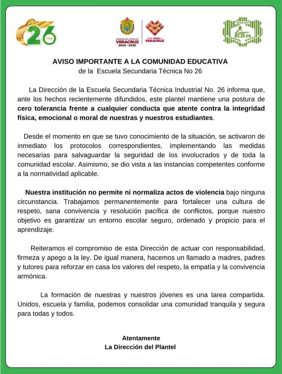 Por estos hechos, más tarde la ESTI número 26 y la Secretaría de Educación de Veracruz (SEVC) se pronunciaron al respecto: