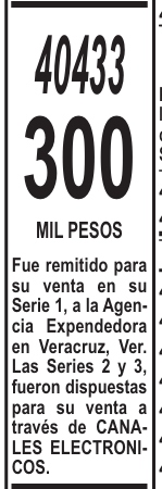 “Fue remitido para su venta en su Serie 1, a la Agencia Expendedora en Veracruz, Ver. Las Series 2 y 3, fueron dispuestas para su venta a través de CANALES ELECTRONICOS”.